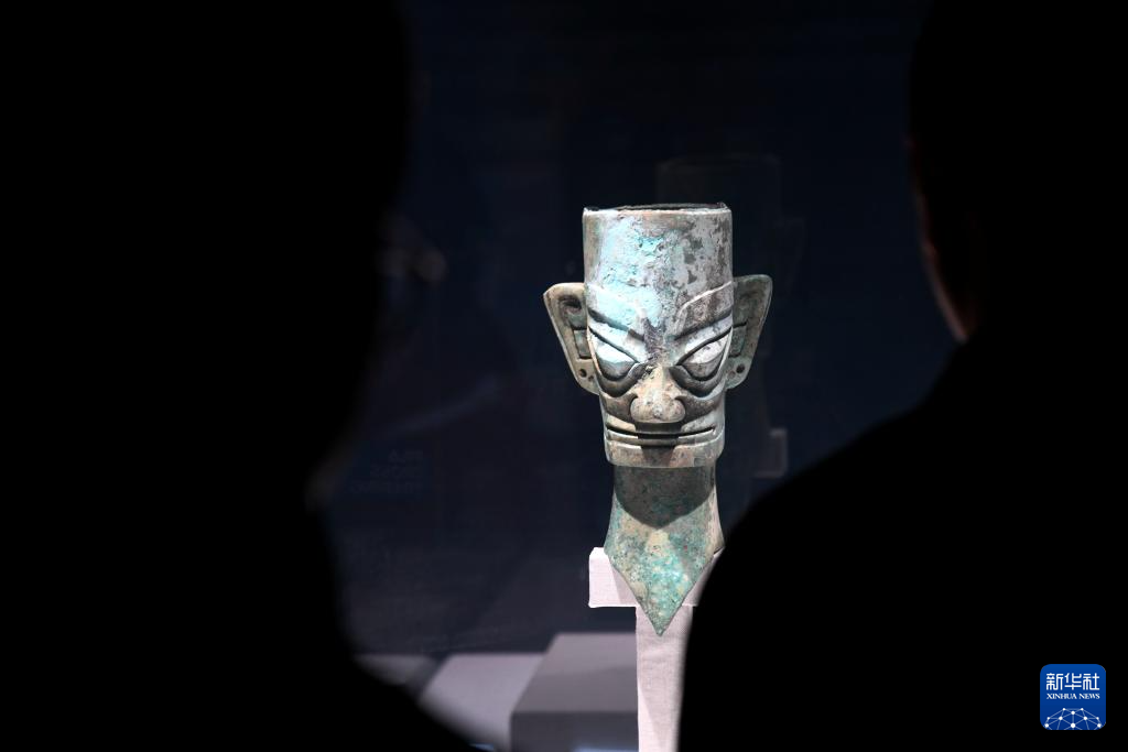 10月25日,观众在秦始皇帝陵博物院观看四川省文物考古研究院馆藏文物铜人头像。