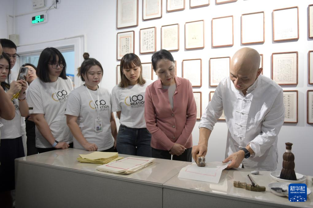 11月8日,魏立中(右一)传授制作木版水印的技艺。
