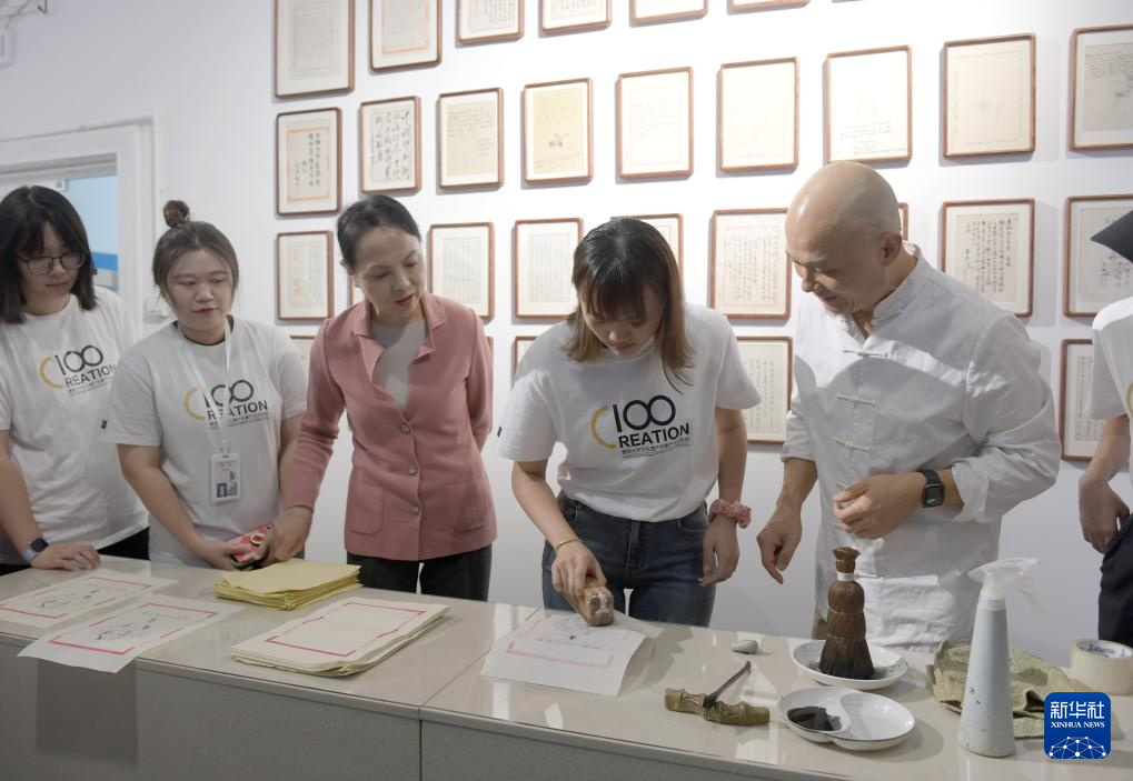 当日,十竹斋木版水印艺术作品展在暨南大学广州石牌校区举行。国家非遗项目木版水印技艺代表性传承人魏立中在展览现场为学生导赏、授课,并指导学生体验木版水印手作的乐趣。