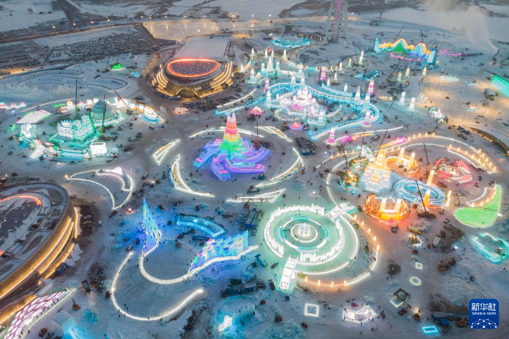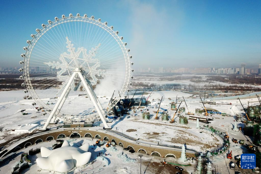 12月14日,工人在哈尔滨冰雪大世界园区建设现场施工(无人机照片)。
