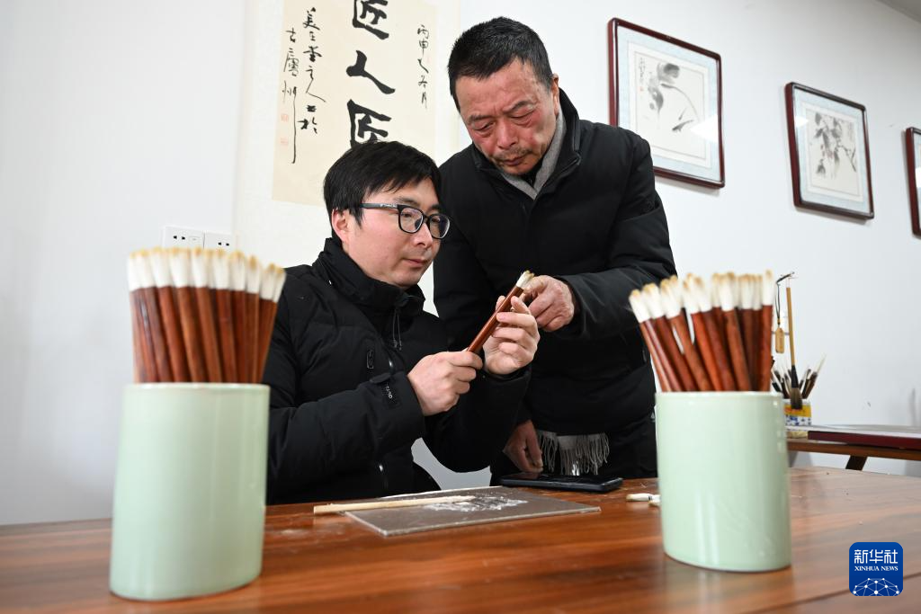 12月20日,佘吉(右)和父亲佘征军查看制作完成的宣笔。