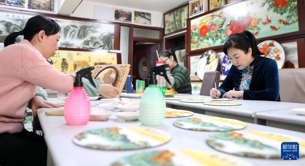 2月27日,刘晶涛(左二)和丈夫谢春波(左一)在凤城市边门镇的车间里探讨画稿创作。