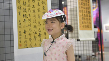 6月15日,在宁夏银川韩美林艺术馆,小朋友为大熊猫图案上色。