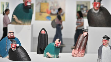 6月15日,在宁夏银川韩美林艺术馆,游客欣赏展出的大熊猫作品。
