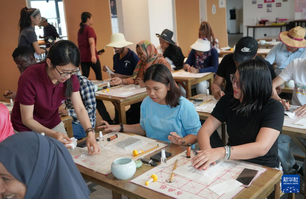 邹天然(左)在易水砚艺术馆指导来自中国农业大学的留学生体验易水砚拓(2023年7月摄)。