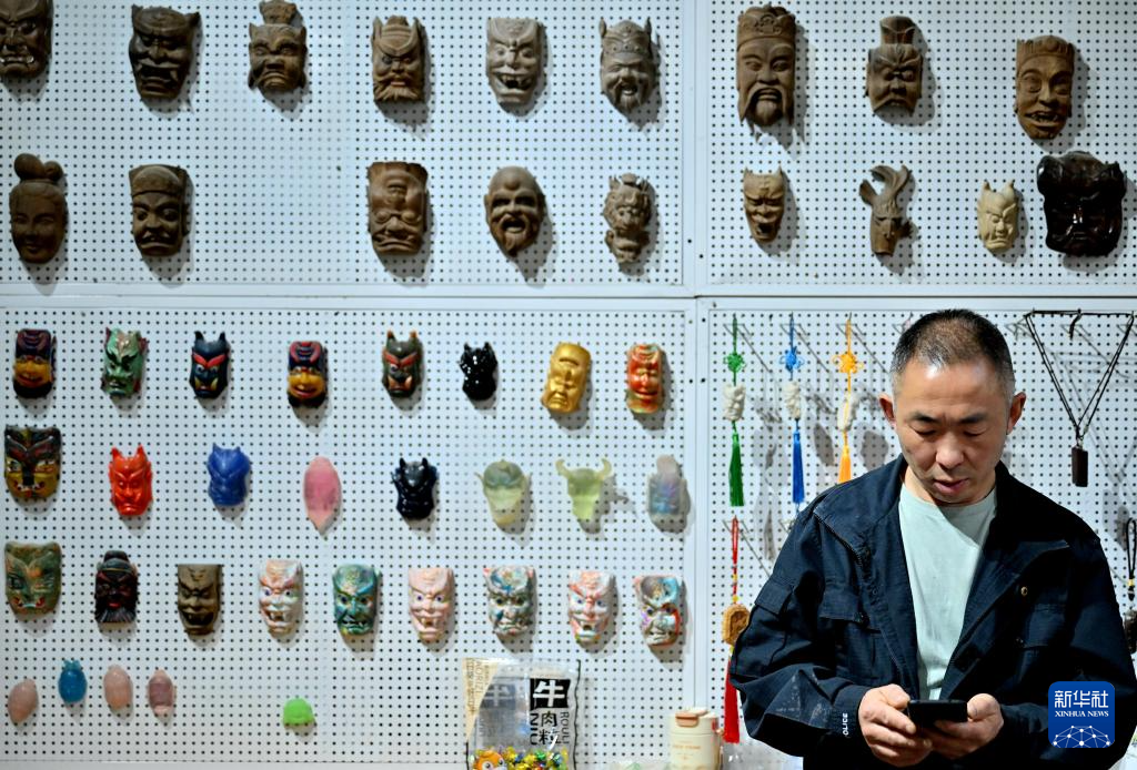 4月15日,汪儒斌在查看傩面具文创产品的网上订单。