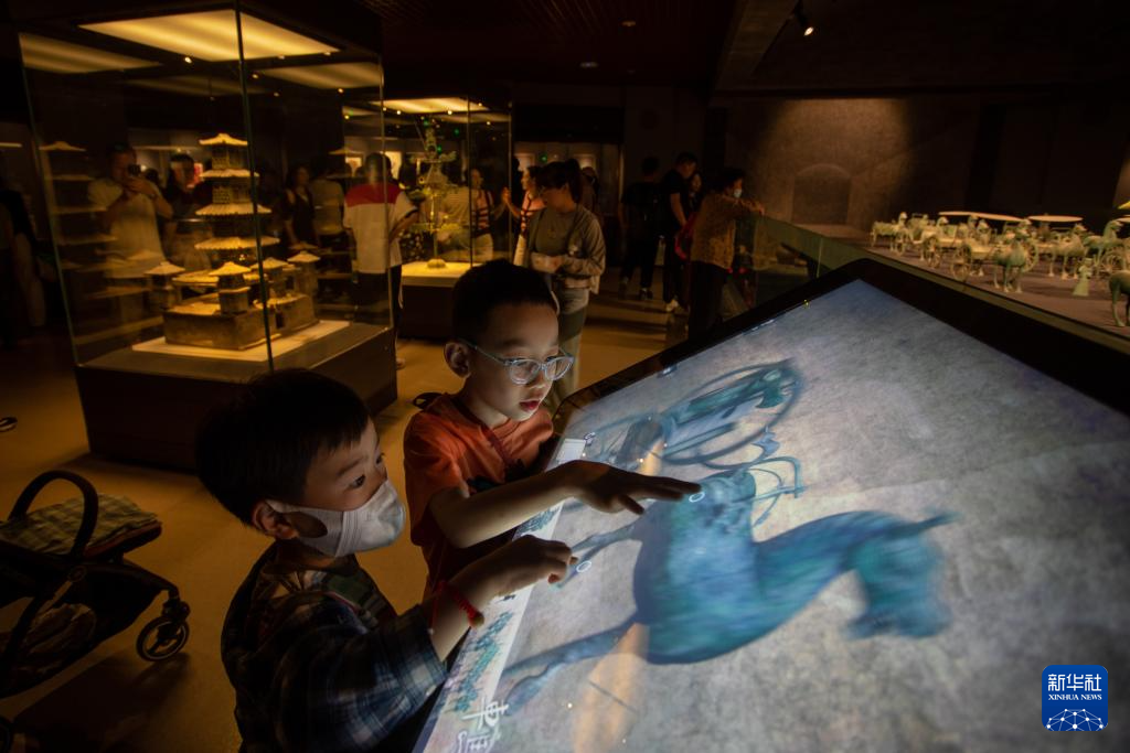 5月18日,游客在甘肃省博物馆体验数字化的文创产品。