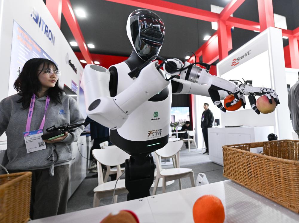 3月3日,在西班牙巴塞罗那举办的世界移动通信大会上,北京人形机器人创新中心推出的人形机器人展示分拣功能。新华社记者 程敏 摄