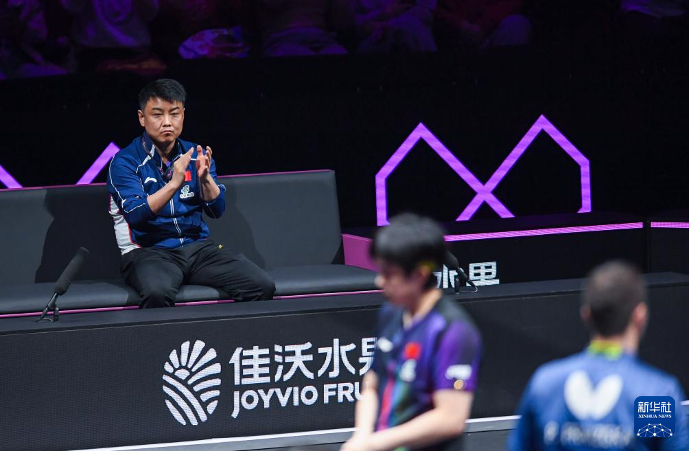 3月12日,教练王皓(左)在比赛中鼓励王楚钦。