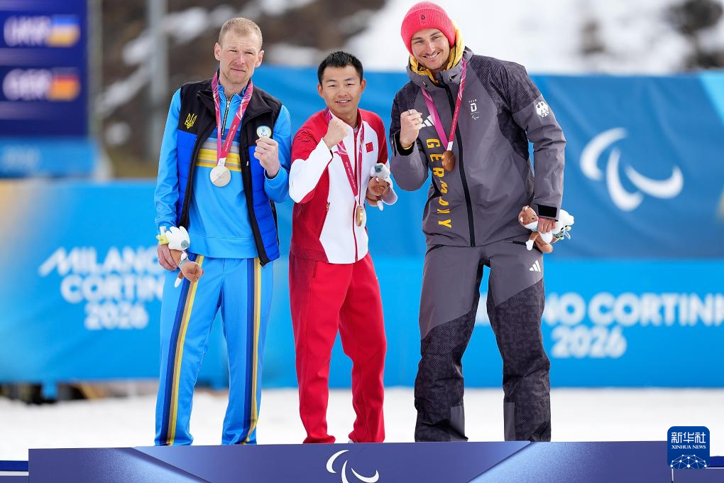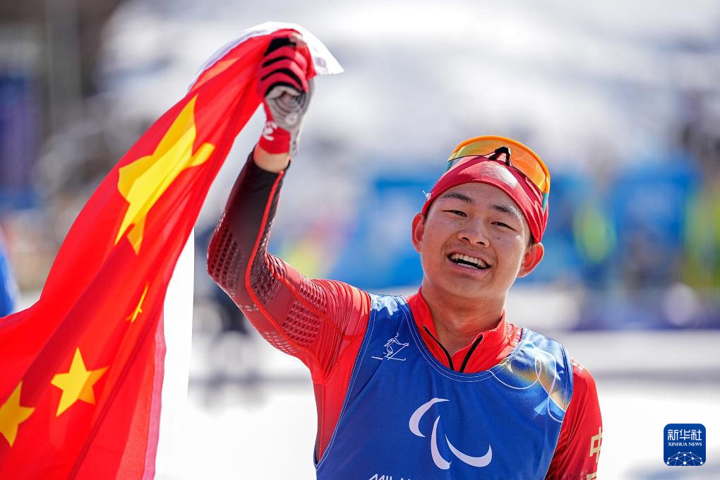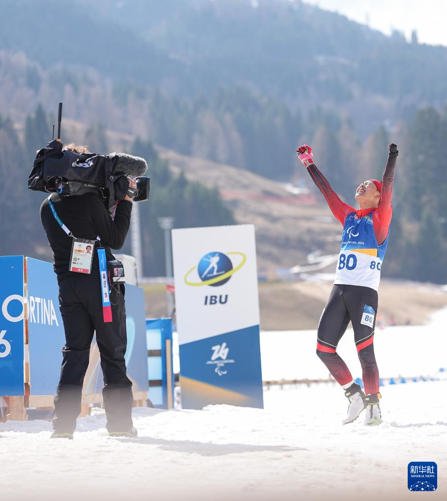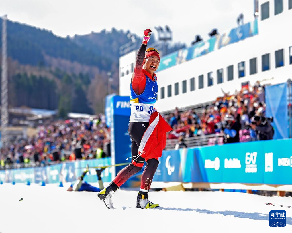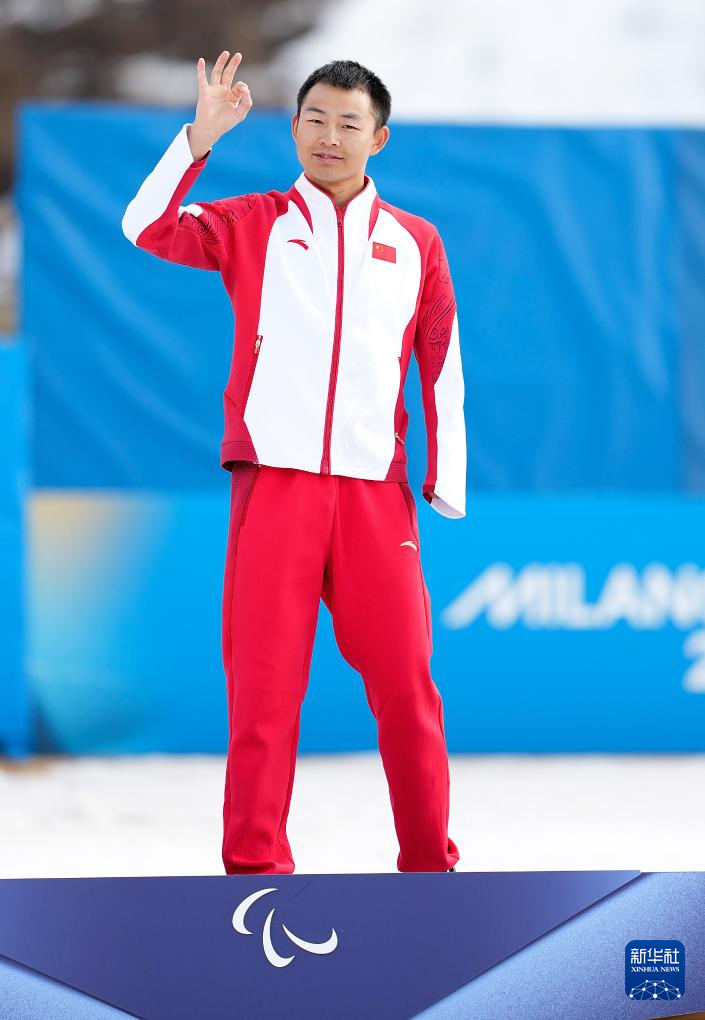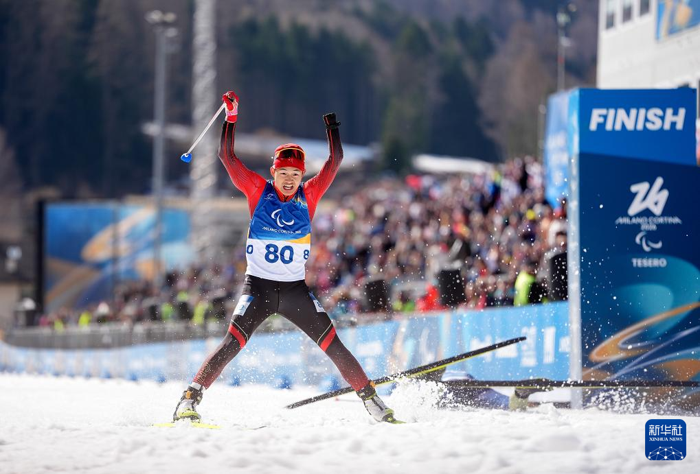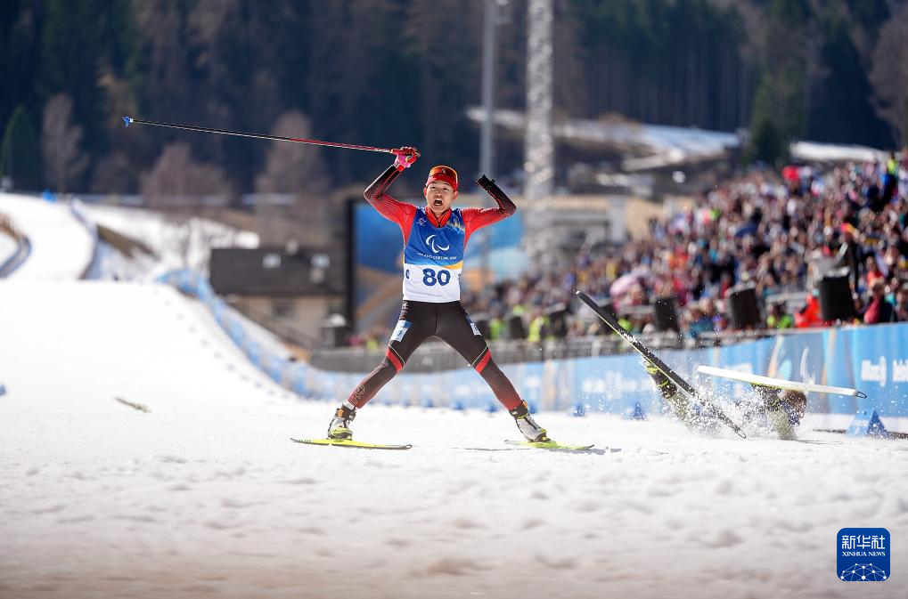 当地时间3月13日,在意大利泰塞罗举行的米兰-科尔蒂纳冬残奥会冬季两项男子短距离追逐(站姿)比赛中,中国选手蔡佳云夺得冠军。
