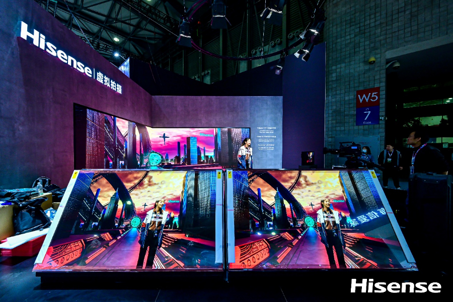 在海信“画质堡垒”等展区,海信围绕显示应用“场景”,以Mini LED、 XR LED三面大屏打造了XR虚拟拍摄技术方案,可以替代电影拍摄的绿幕拍摄技术,让用户在现场即可入镜体验虚拟拍摄的魔幻效果,实现所拍即所得;以真车模型虚实结合,展示了海信在抬头显示(HUD)、车载显示与座舱娱乐系统的布局;以高端激光显示产品结合艺术家主题影像,打造了“强交互、强体验、强沉浸”的光影体验,展示了激光显示广阔的场景应用空间……