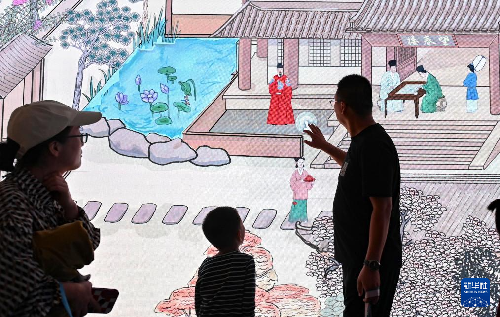 10月5日,在山东省青州博物馆,游客通过大屏幕进行场景互动。