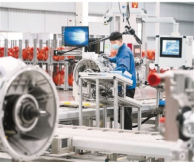 工作人员在陕西省西安市高新区的某智慧工厂内检测变速器成品。 新华社记者 邵 瑞摄