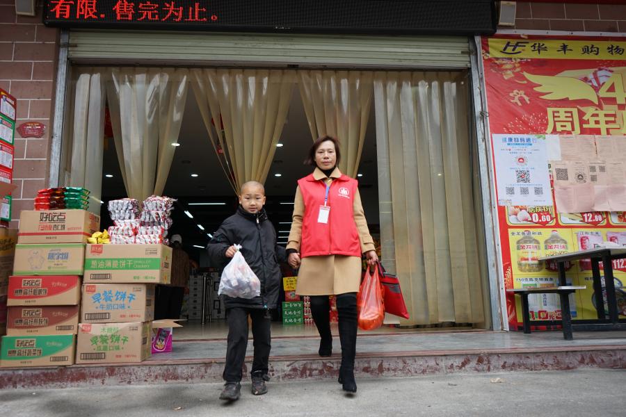 2日,清空購(gòu)物清單后的明宇牽著“媽媽”的手一起走出超市。(新華社記者袁慧晶攝)