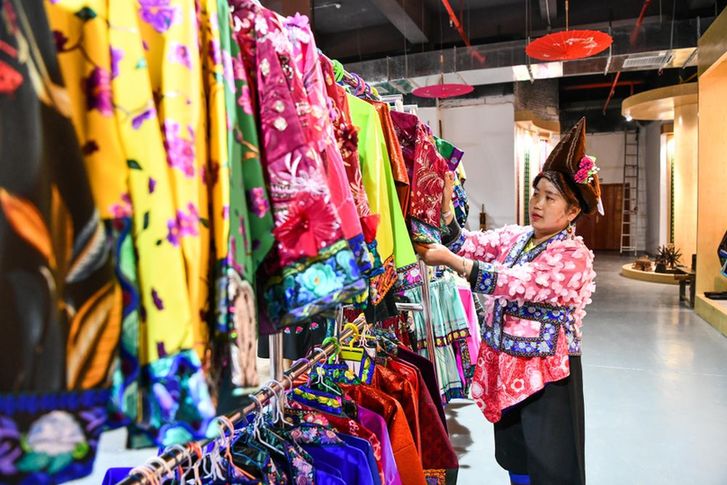 看到我們的生意越做越火,村里更多的姐妹也想加入進來,于是,我在2014年成立了民族刺繡專業(yè)合作社,組織大家一起生產(chǎn)。人多了、機器多了、創(chuàng)意也多了。我們把苗繡元素與現(xiàn)代服飾相結(jié)合,把不同大小、圖案的繡片點綴縫制在背包、衣服、鞋子上,讓消費者無論逛街還是上班都能穿,很受市場歡迎。