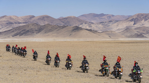 西藏日喀則市薩嘎縣昌果鄉(xiāng)的一處村莊里,48歲的藏族漢子石覺(jué)塔布在風(fēng)中跨上一輛摩托車,向平坦無(wú)垠的高原邊緣騎去。他的車尾插著一面五星紅旗,被風(fēng)吹得獵獵作響,即便駛出很遠(yuǎn),那抹紅色在車輪卷起的煙塵中也依然醒目。