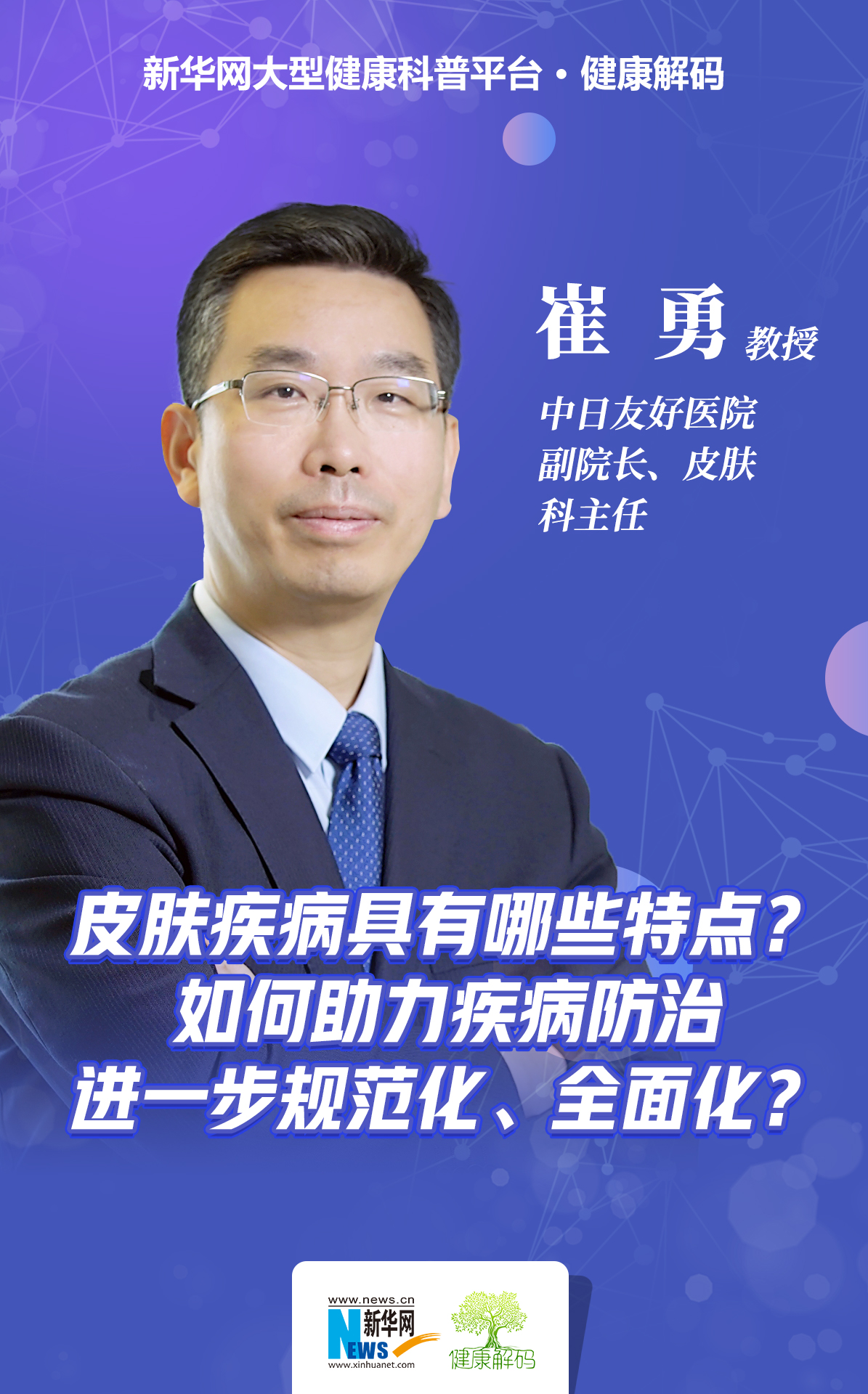 崔勇:皮肤是我们人体最外在的一个器官,它是接触外界的,所以受到的伤害是很多的,这是第一个特点,病种很多;第二个,受皮肤病影响的人也很多,对医院而言,皮肤科也常是门诊量最大的科室之一,因此皮肤病的疾病负担是比较重的。所以,从皮肤科的角度来讲,我们确实要加大力量去提升我们对皮肤疾病管理的能力、治疗的能力,我觉得这样是有助于整体人民健康的。