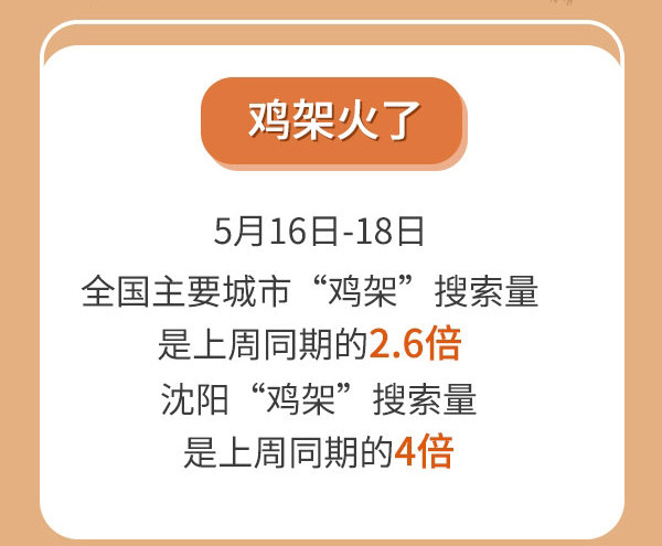 ????? 所謂雞架,就是整只雞去掉雞腿、雞爪、雞胸等剩下的骨架,然后運用水煮、烤、炸、熏、炒等多種烹飪手法,讓雞架變得有滋有味。 5月16日-18日,隨著“雞架”一詞的出圈,全國主要城市雞架”搜索量明顯攀升,其中“沈陽雞架”的搜索量是上周同期的四倍。