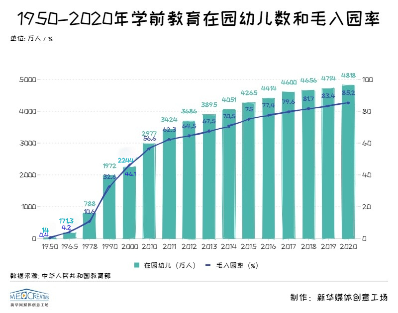 新中國成立以來,我國學前教育實現了快速發(fā)展。1950年我國學前教育在園兒童人數僅為14萬人,這個數字在2020年達到4818萬,學前教育毛入園率更是從1950年0.4%提高到2020年的85.2%。
