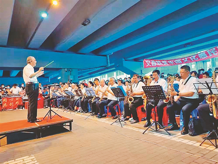 遇到觀眾熟悉的曲目,王輝會(huì)帶動(dòng)觀眾一起演唱;幾乎每首樂(lè)曲結(jié)束,都能聽(tīng)到觀眾的叫好聲?!坝^眾是我們的動(dòng)力,退休后有這樣的文化生活相伴,我的心情也很愉悅?!苯衲?2歲的王福心在樂(lè)團(tuán)中吹大號(hào)已經(jīng)十幾年,年輕時(shí)從事建筑行業(yè)的他坦言樂(lè)團(tuán)豐富了他的退休生活。