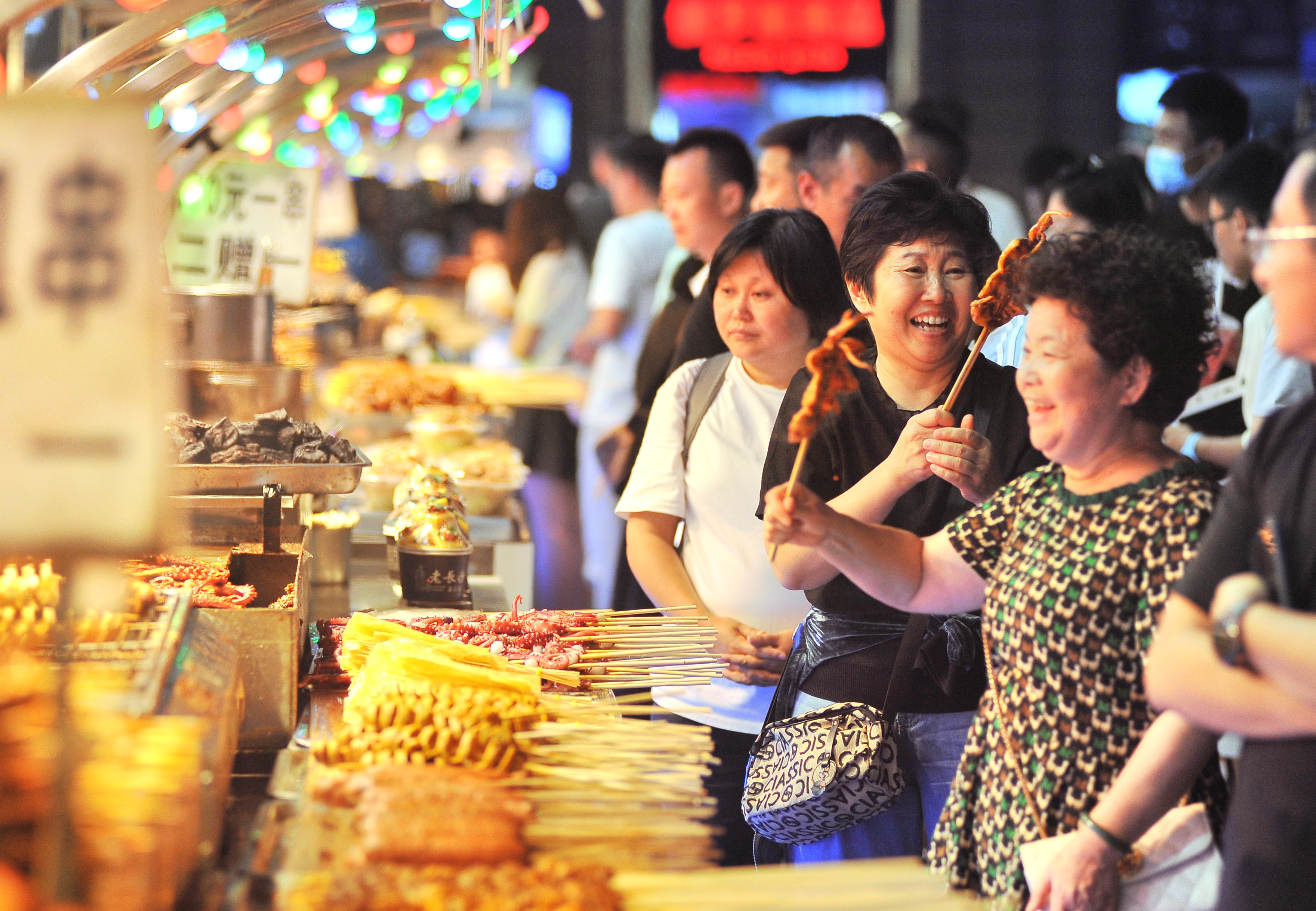人們一邊逛、吃,一邊欣賞著街邊的文藝演出,十分愜意。
