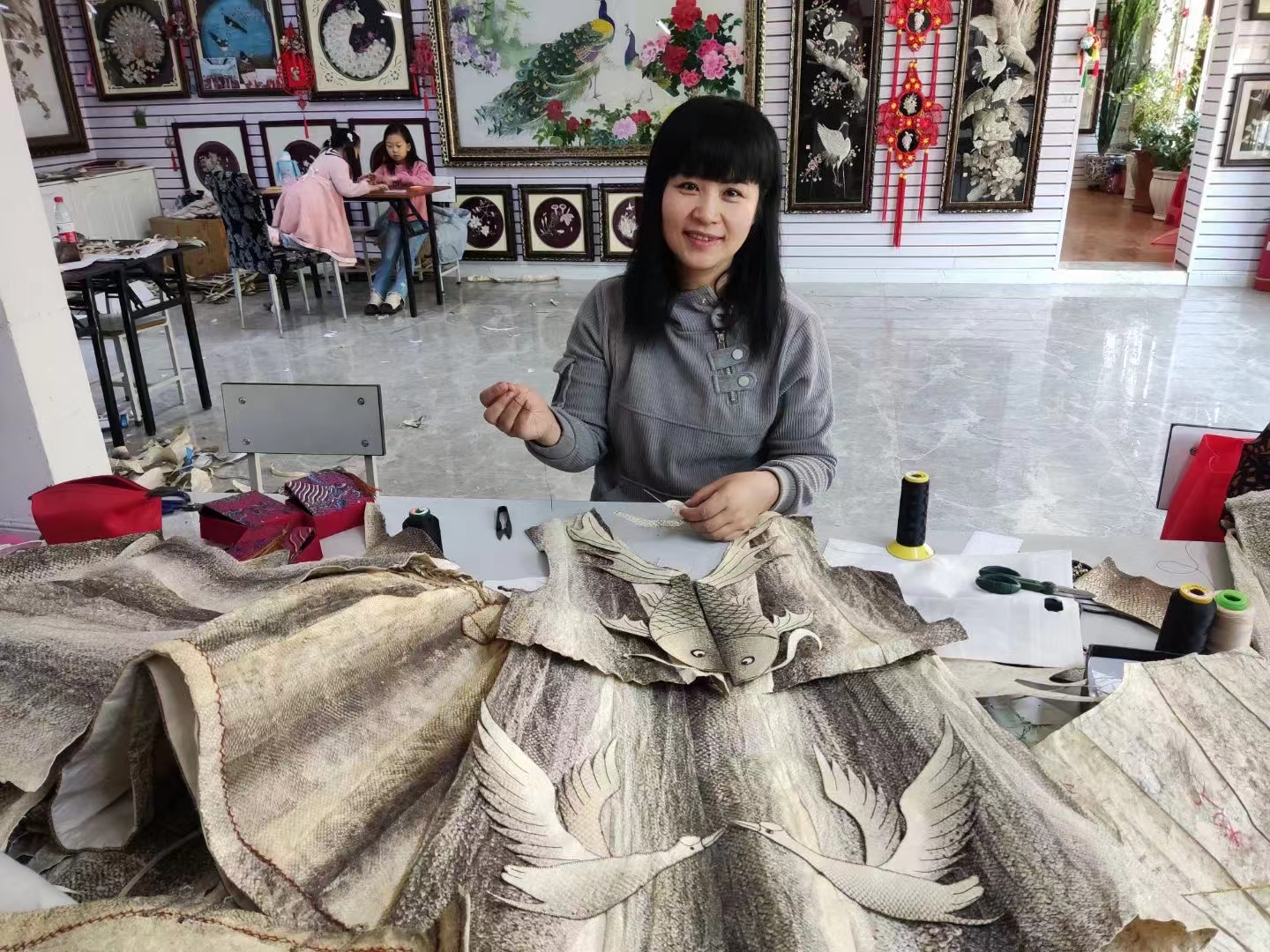 2015年,以農(nóng)民技師為主的魚皮畫農(nóng)民合作社成立,2016年,楊雙艷成立同江市巧手坊,同年楊雙艷被評(píng)為同江市非遺代表性傳承人。至此,楊雙艷的非遺之路上了新臺(tái)階,她和學(xué)員們創(chuàng)作非遺產(chǎn)品1萬余件,其中,建黨百年制作舉辦了百人百幅剪紙、13米長(zhǎng)赫哲族婚俗系列長(zhǎng)卷、魚皮畫作品《長(zhǎng)城》、魚皮立體刺繡作品《大吉圖》《浩氣凌空》等作品參加了全國(guó)多項(xiàng)工藝美術(shù)大賽,收獲頗豐。