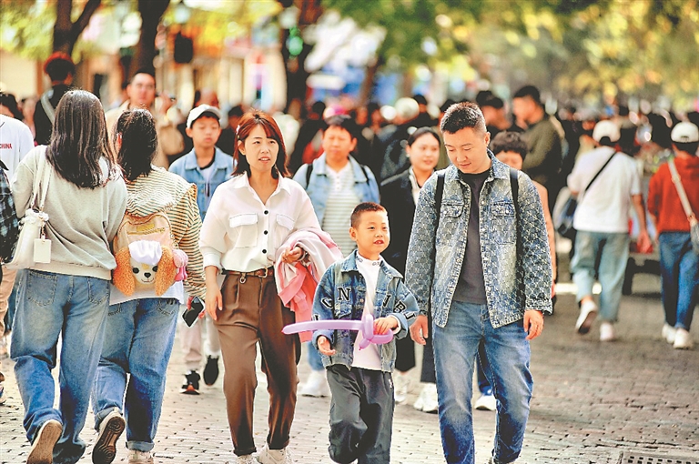 16日,在哈爾濱市道里區(qū)中央大街上,許多市民和外地游客逛街、賞景、拍照,在美好的節(jié)日氛圍中樂享中秋假期。