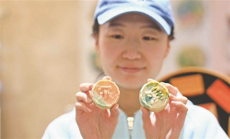 在哈爾濱市索菲亞景區(qū)旁邊的一家蛋糕店內(nèi),以索菲亞教堂、哈爾濱站、雪花摩天輪等哈爾濱地標(biāo)建筑為造型,由“雪花”以及“千里江山圖”“金魚滿堂”等傳統(tǒng)吉祥圖案制作而成的文創(chuàng)月餅受到游客和市民的青睞。