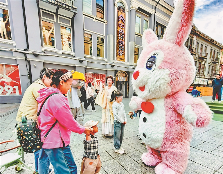 街道兩側(cè)的樹木盡顯秋色,與百年建筑相互映襯,如同一幅美麗的油畫。人們紛紛用手機(jī)記錄下精彩瞬間。美食攤位前,烤肉串、烤紅腸、烤魷魚、鍋包肉等散發(fā)出的香味令人垂涎欲滴;冰棍、格瓦斯、大面包等本地特色食品吸引游客排隊(duì)購買;熊貓、老虎、兔子等卡通人偶站在路旁,與游人互動、合影。