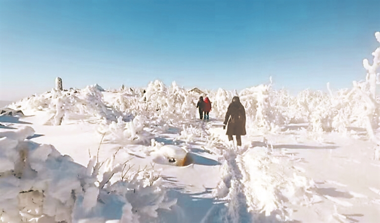 “那知忽作三尺雪,草木洗盡群芳空。”雪后的松峰山一身銀裝素裹,在山里行走,仿佛置身潔凈的水晶宮中,滿山遍野的樹枝在朝陽下白凌閃爍。蜿蜒曲折的山間棧道上,皚皚白雪舞長龍,微風(fēng)一吹蘆花飛。起初體力充沛,腳踩在雪上嘎吱嘎吱聲變成踏雪前行的輕歌小曲,心逐漸隨著勻稱的步伐變得安靜飄逸,腳下一步緊接一步地向前邁進(jìn),灑滿腳印的路在我們身后越拉越長。