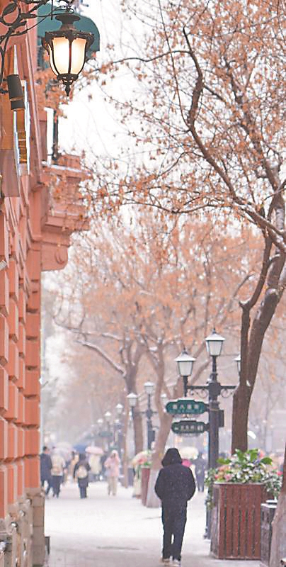 人漸漸多起來,我看見防洪紀念塔就在眼前,這時的江岸邊已經人挨人了。紀念塔前幾名少年正在演唱第九屆亞冬會會歌《爾濱的雪》。歌聲稚嫩親切,孩子們舉著道具雪花,頭頂上只戴著耳包,唱得令人心熱。我從過街通道向中央大街走去,這里已是人如潮涌了。不知他們是來自華東還是西南、西北的小金豆,說著我們聽不太懂的方言,但開懷的笑聲和我們相同,開心的笑容我們看得清。