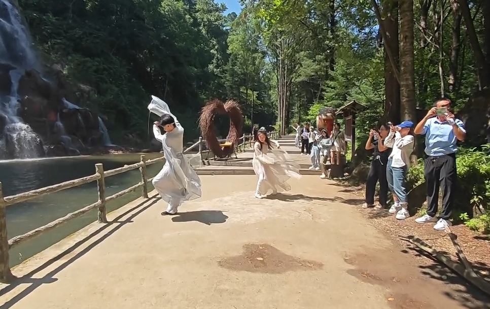 在鴛鴦瀑布旁,“相思劍·意難平”主題表演獨(dú)具韻味。以水流奔涌的瀑布為背景,表演者一襲素衣,執(zhí)劍起舞,招式間既有凌厲之勢(shì),又含繾綣柔情,將“相思難平”的情愫演繹得淋漓盡致?!霸谄俨歼吙催@場(chǎng)表演太有感覺(jué)了,飛濺的水花與靈動(dòng)的劍光相映,山水的磅礴和劍意里的深情融在一起,看得人心里都跟著泛起波瀾?!爆F(xiàn)場(chǎng)游客感慨道。