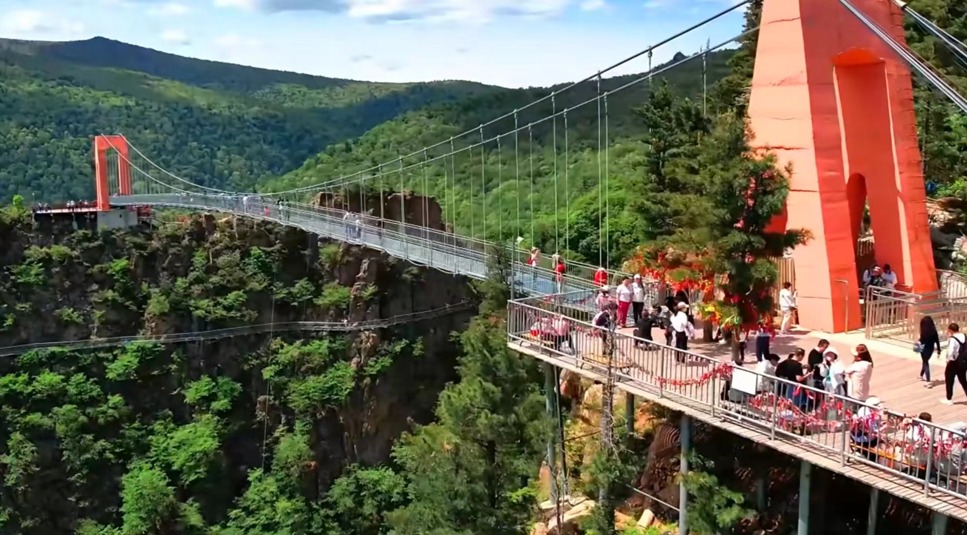 景區(qū)內(nèi),蜿蜒的玻璃棧道依山而建,既保證了游客走得安全平穩(wěn),又能讓大家將周圍的美景盡收眼底,細(xì)節(jié)處盡顯設(shè)計(jì)巧思。尤其是橫跨兩山之間的玻璃鵲橋,堪稱點(diǎn)睛之筆。橋面由高強(qiáng)度透明玻璃鋪設(shè),行走其上,腳下是深谷幽林,身旁是流云清風(fēng),仿佛置身半空之中。陽(yáng)光透過(guò)玻璃灑下,與遠(yuǎn)處的青山綠水交相輝映,每一步都像是踏在光影編織的幻境里,既驚險(xiǎn)刺激,又浪漫唯美。