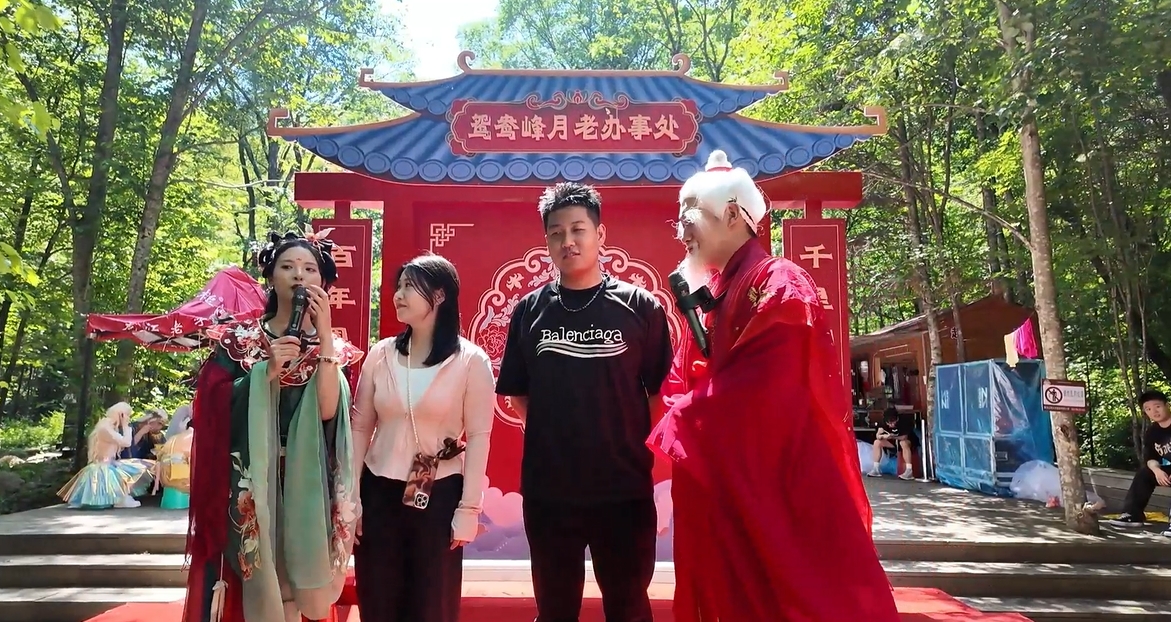 “緣分天注定,更要看人和。兩個(gè)人看對(duì)眼了,這緣分不就來(lái)了嘛!現(xiàn)場(chǎng)單身的帥哥和美女在哪里,向我們揮揮手……”身著傳統(tǒng)服飾的“月老”與“紅娘”在“鴛鴦峰月老辦事處”熱情接待游客,與單身男女積極互動(dòng)?;顒?dòng)推出的“弄不倒的愛(ài)情”互動(dòng)游戲成為全場(chǎng)焦點(diǎn)。游客們紛紛伸手參與,與演員們親密互動(dòng),現(xiàn)場(chǎng)氣氛很熱鬧。