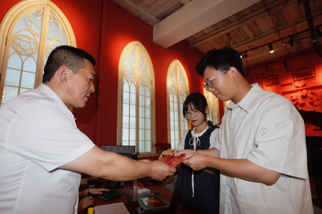 活動(dòng)現(xiàn)場(chǎng),首對(duì)在此辦理登記的新人劉先生與李女士表示:“在這里領(lǐng)證,比在普通登記處更有儀式感,仿佛穿越時(shí)空,感受到了別樣的浪漫?!?/p>