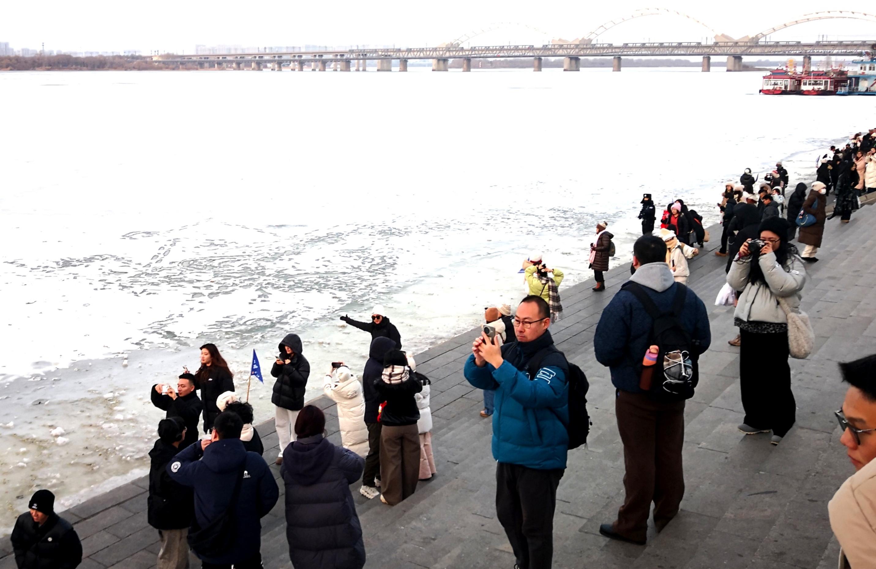 29日,哈爾濱市道里區(qū)松花江畔,許多游客在打卡拍照。
