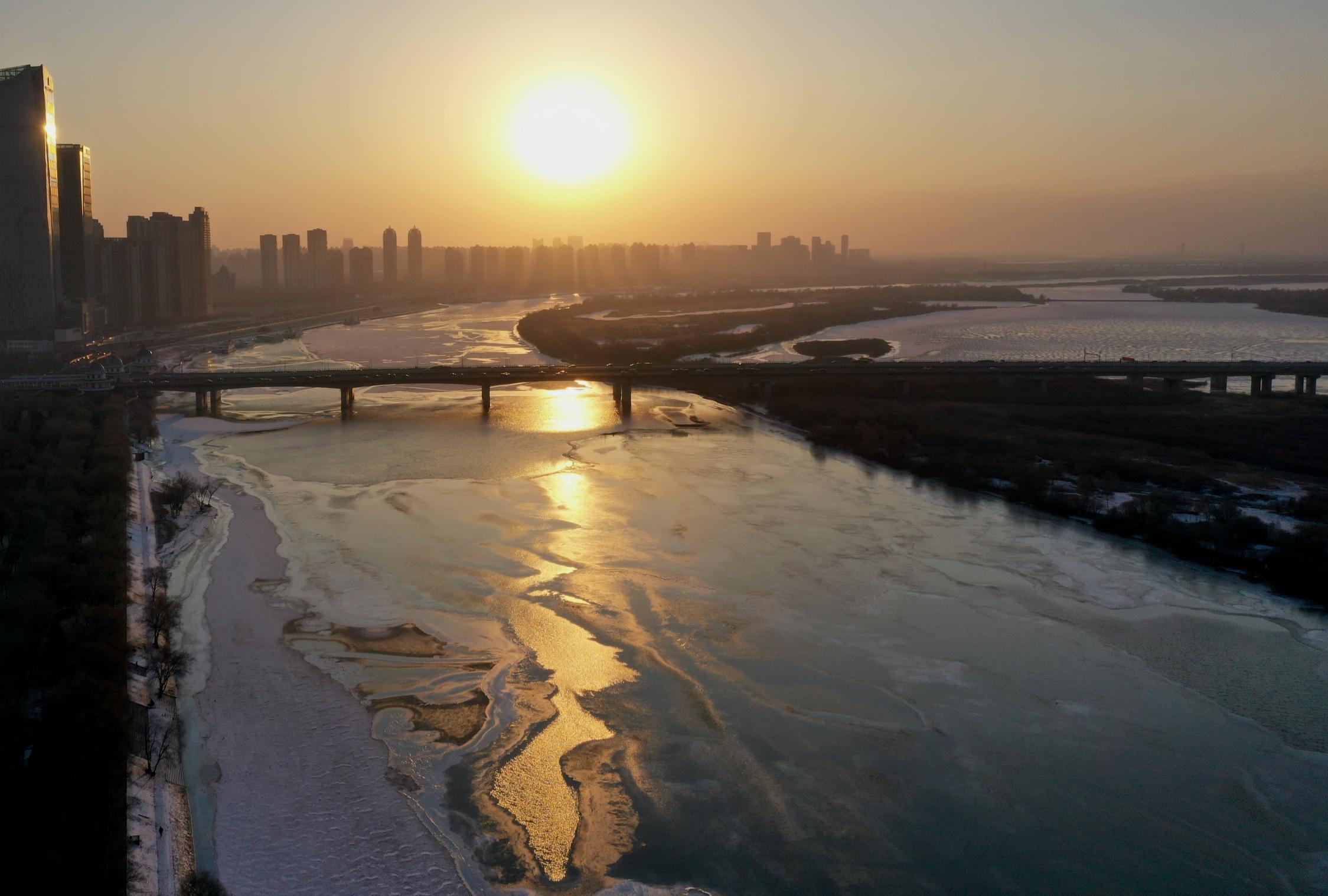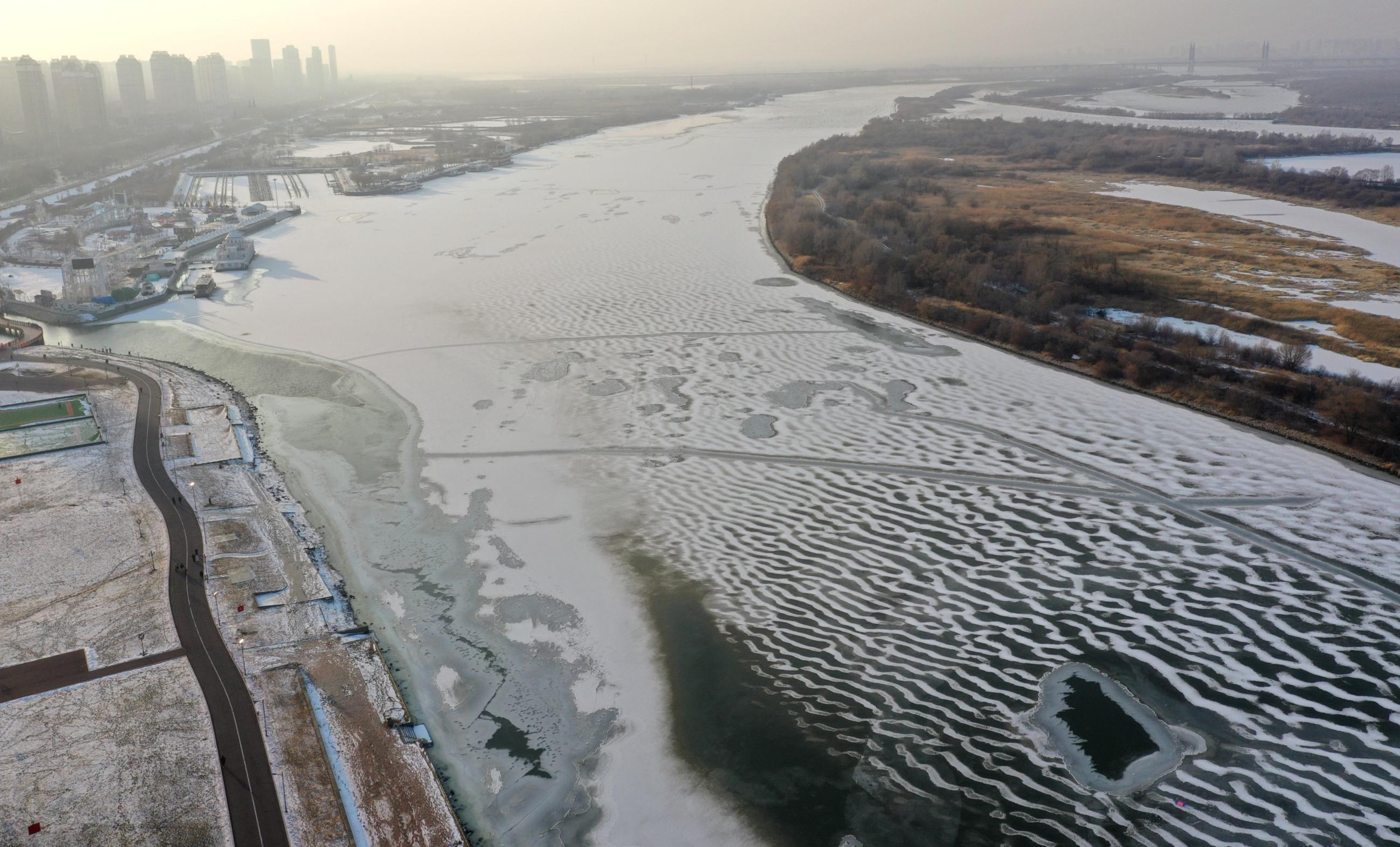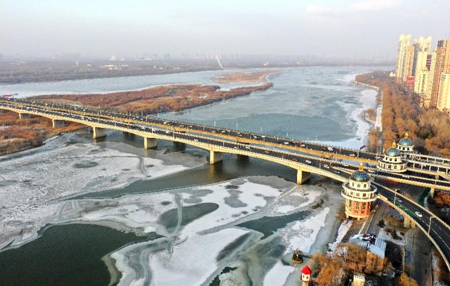 目前,除了何家溝入口附近還有部分水面外,主城區(qū)的松花江已經(jīng)封凍。從高空看去,冰凍的江面美麗又壯觀。