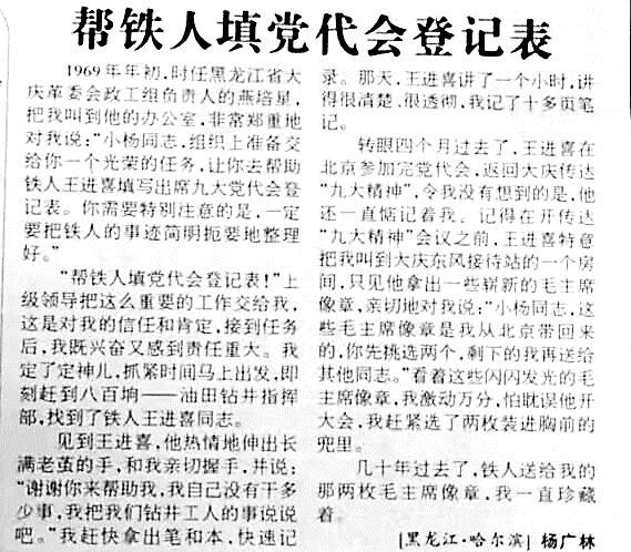 我常常向省報(bào)旗下的《老年日?qǐng)?bào)》投稿,通過文字記錄全省公安系統(tǒng)老干部的學(xué)習(xí)動(dòng)態(tài)與奮斗精神,分享他們的經(jīng)驗(yàn)與智慧。令我感到欣慰的是,不少稿件獲得了刊載,其中有一篇回憶文章,講述的是我在大慶工作期間的一段珍貴經(jīng)歷。那是在1969年,組織上委派我為鐵人王進(jìn)喜同志填寫黨的九大代表登記表,這是一項(xiàng)光榮而嚴(yán)肅的政治任務(wù)。王進(jìn)喜參加完九大回到大慶后,為了表達(dá)感謝與情誼,特意贈(zèng)送給我兩枚珍貴的毛主席像章。其中一枚,是他出席九大時(shí)一直佩戴在胸前的,具有特殊的歷史意義和紀(jì)念價(jià)值。他親手將其摘下贈(zèng)予我,讓我深受感動(dòng)。這兩枚像章不僅是我們之間深厚情誼的見證,更是那個(gè)特殊年代的歷史印記。后來,經(jīng)多方協(xié)商與慎重考慮,我將它們捐贈(zèng)給了大慶鐵人紀(jì)念館,作為重要文物永久收藏并展出,以此傳承鐵人精神,也讓更多人了解和銘記那段光輝歲月。
