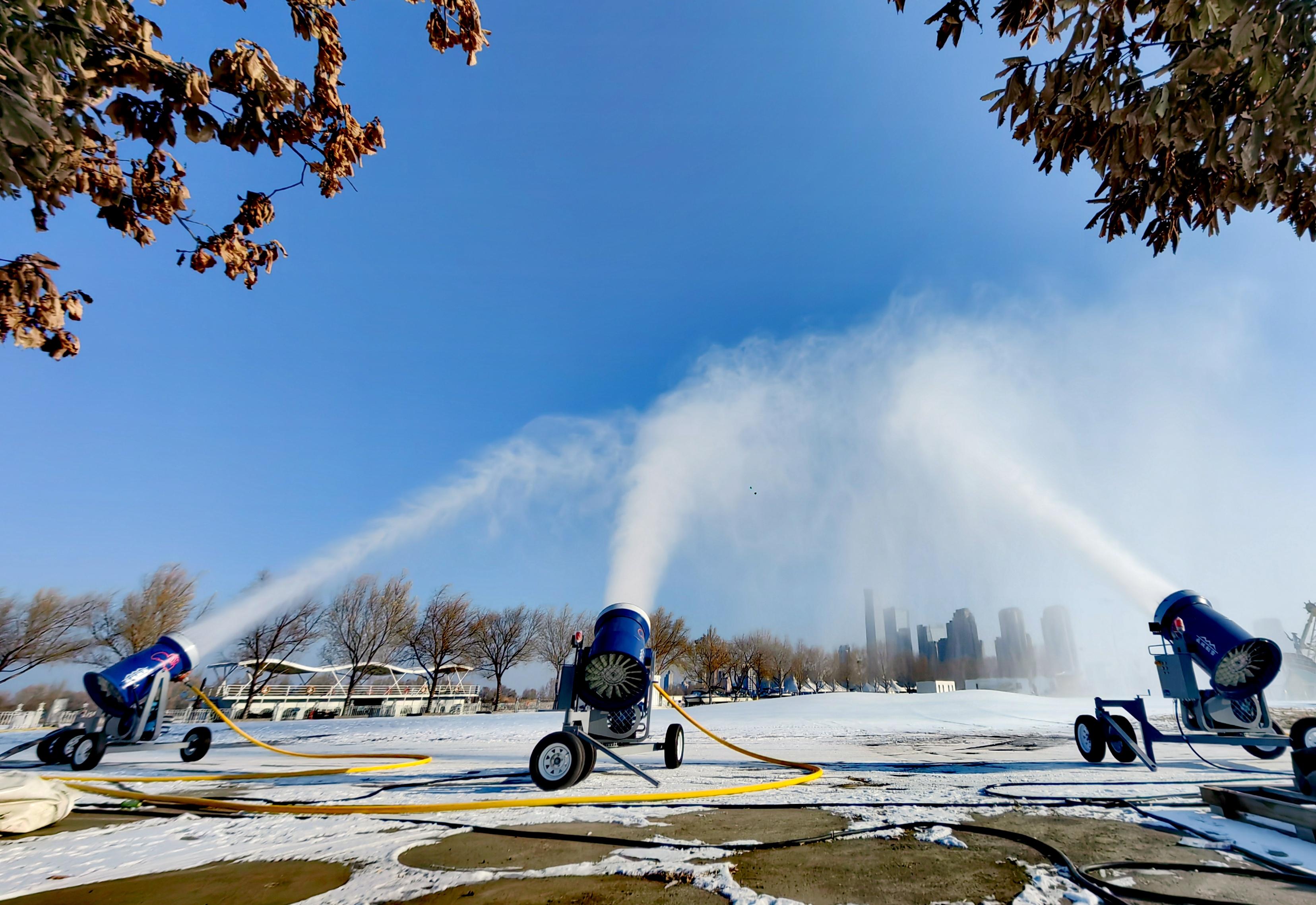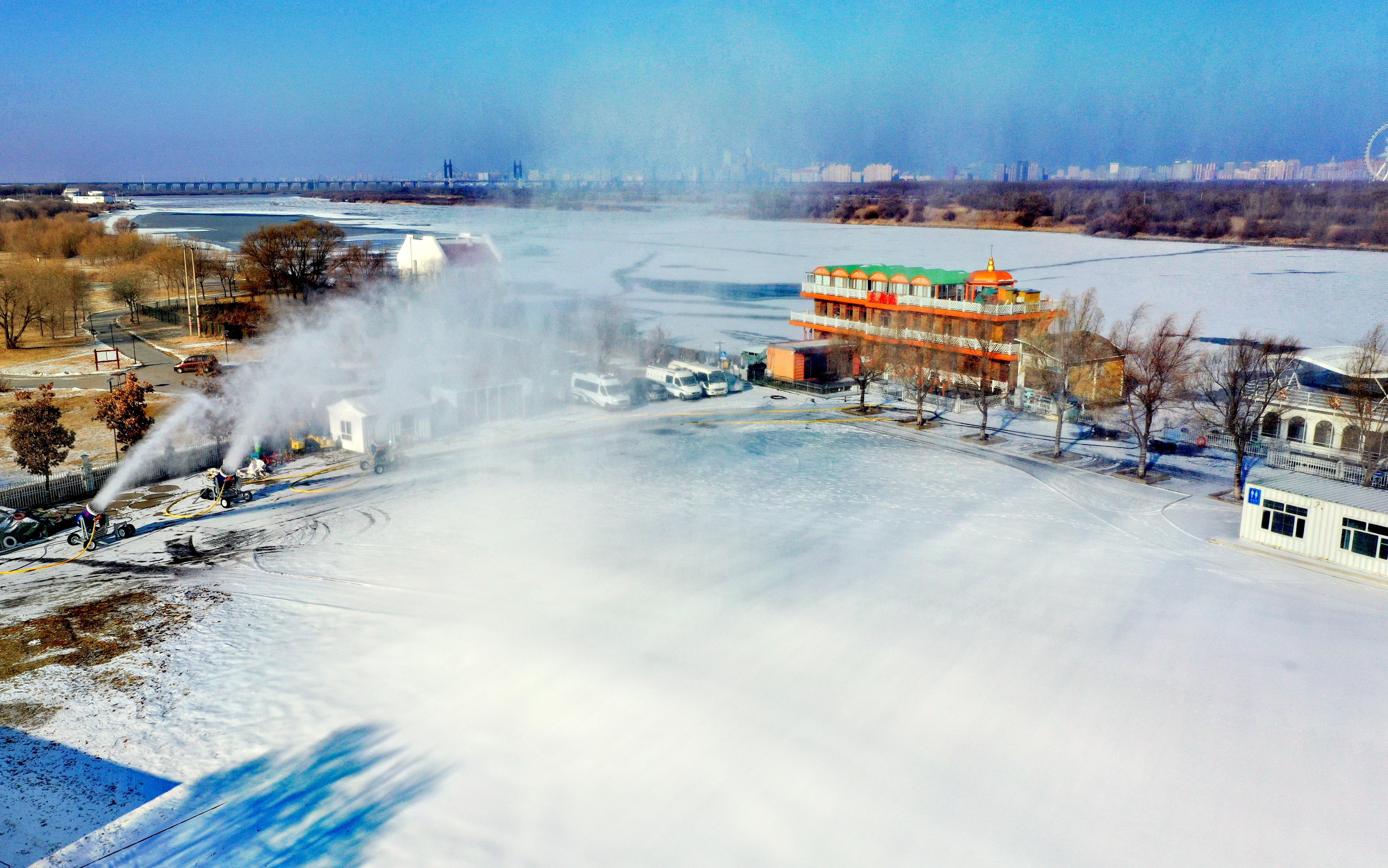 11月30日,哈爾濱市道里區(qū)群力江畔的一處冰雪景區(qū)內(nèi),四臺(tái)造雪機(jī)開足馬力進(jìn)行人工造雪,吸引許多游人觀看。