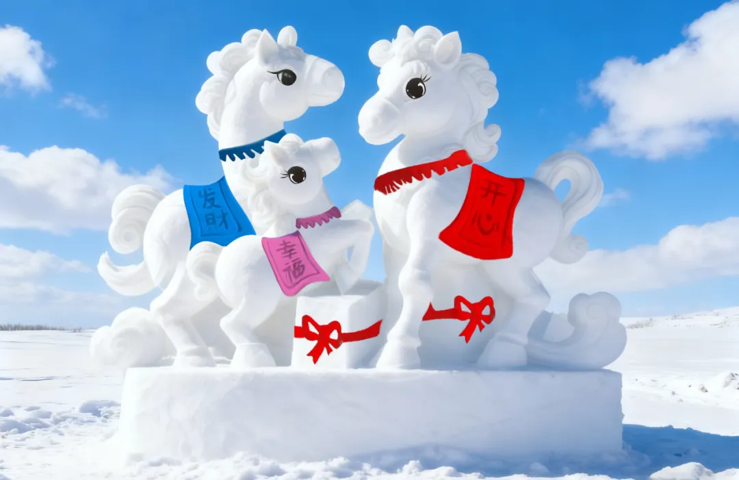 值得一提的是,雪雕工匠們會為“童話小馬一家”披上定制巨型馬鞍和圍巾,并配上吉祥語,為游客送上“馬上發(fā)財”“馬上幸?!薄榜R到成功”的美好祝福,還將在春節(jié)時進(jìn)行換裝。