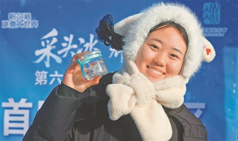 免費(fèi)品嘗江魚和水餃、領(lǐng)取幸運(yùn)冰塊、選購非遺好物、與冰糖葫蘆和凍梨雪雕合影……采冰節(jié)現(xiàn)場的互動區(qū)內(nèi)人潮涌動,格外熱鬧。在這里,市民和游客不僅能享受到冰雪帶來的歡樂,更能沉浸式領(lǐng)略龍江文化的深厚底蘊(yùn)與獨特魅力。