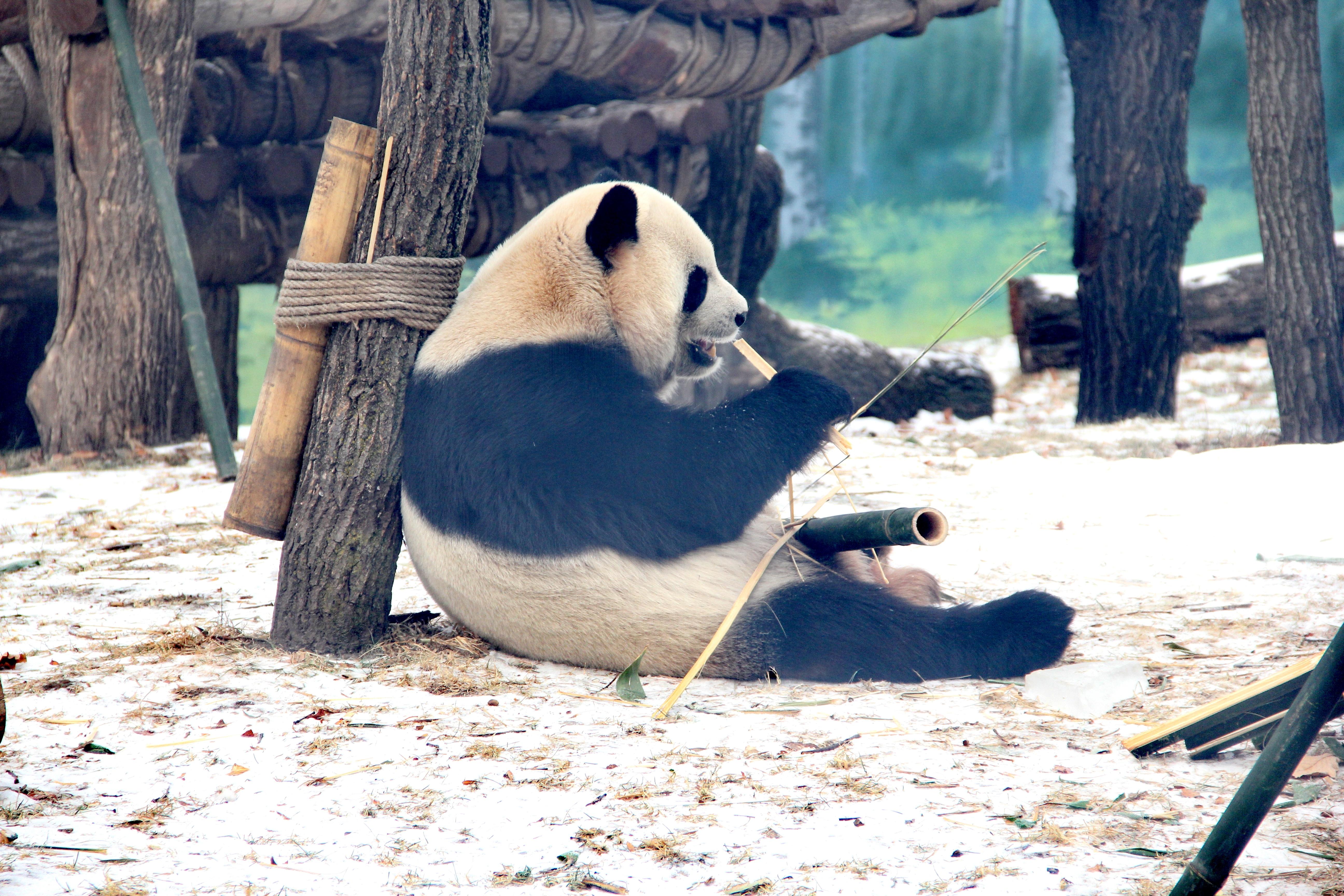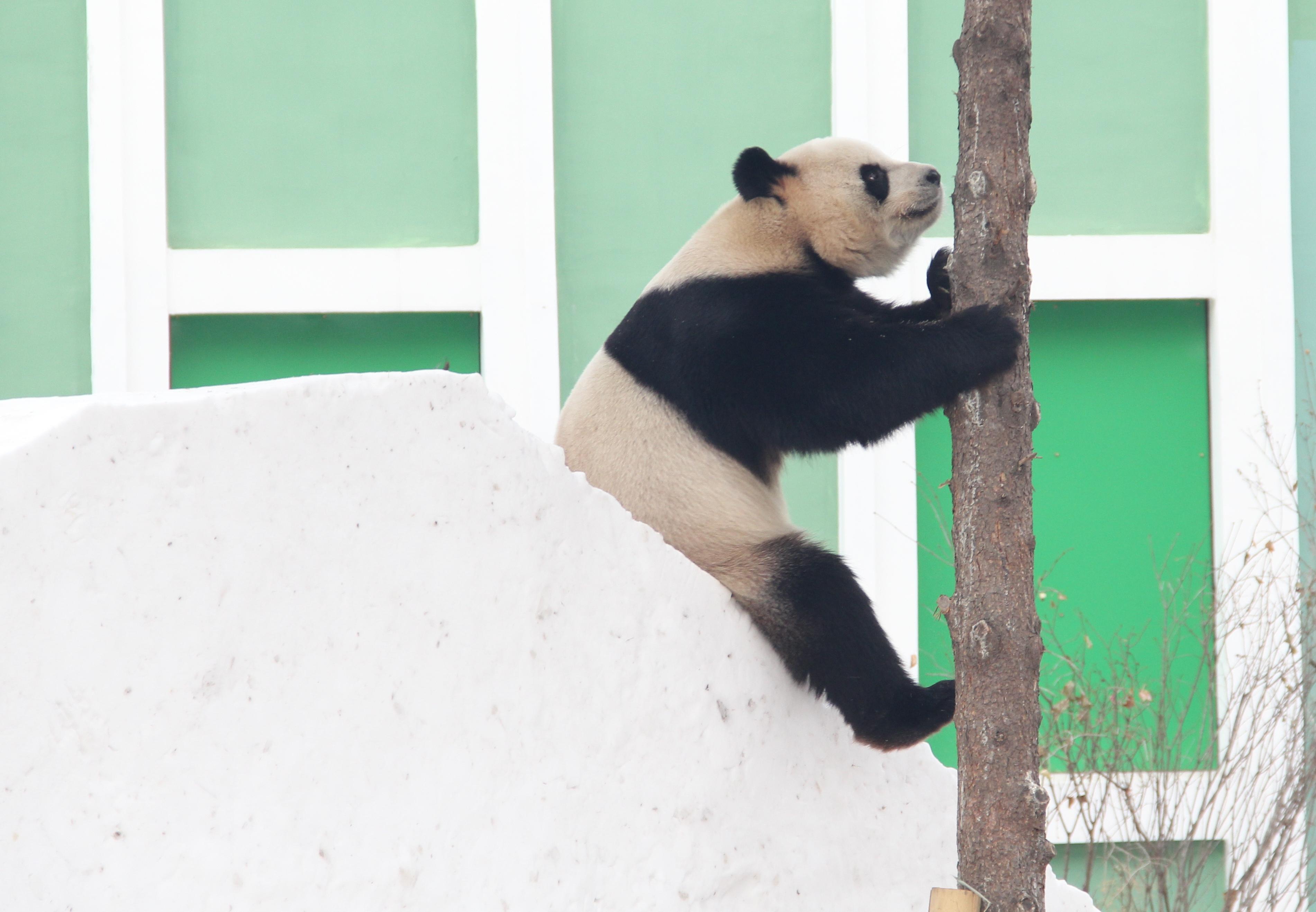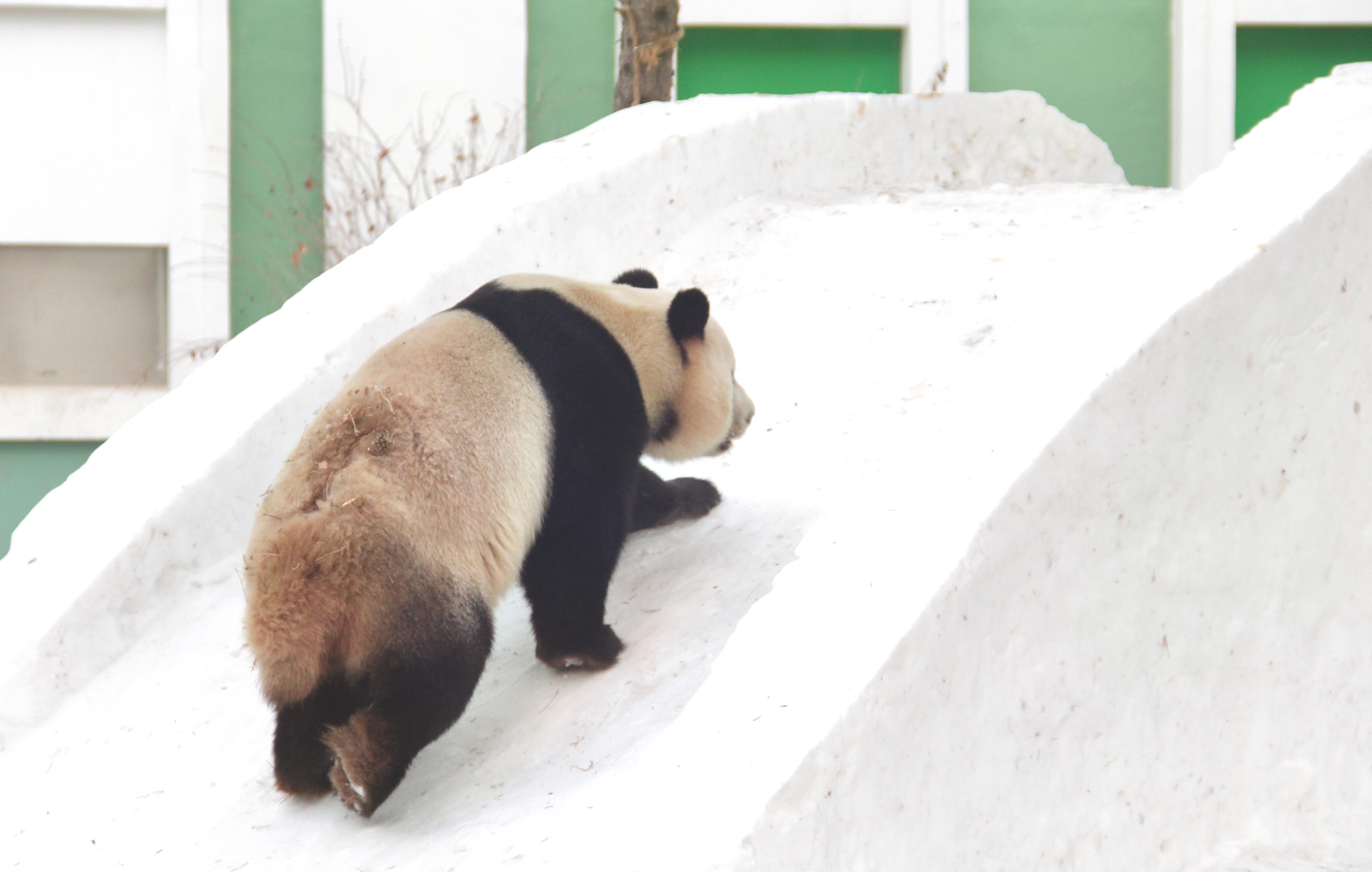 憨態(tài)可掬的大熊貓時而坐在雪地里吃著美味的竹子,時而在雪地里散步、玩耍,時而爬上工作人員制作的雪滑梯,打個“出溜滑”……