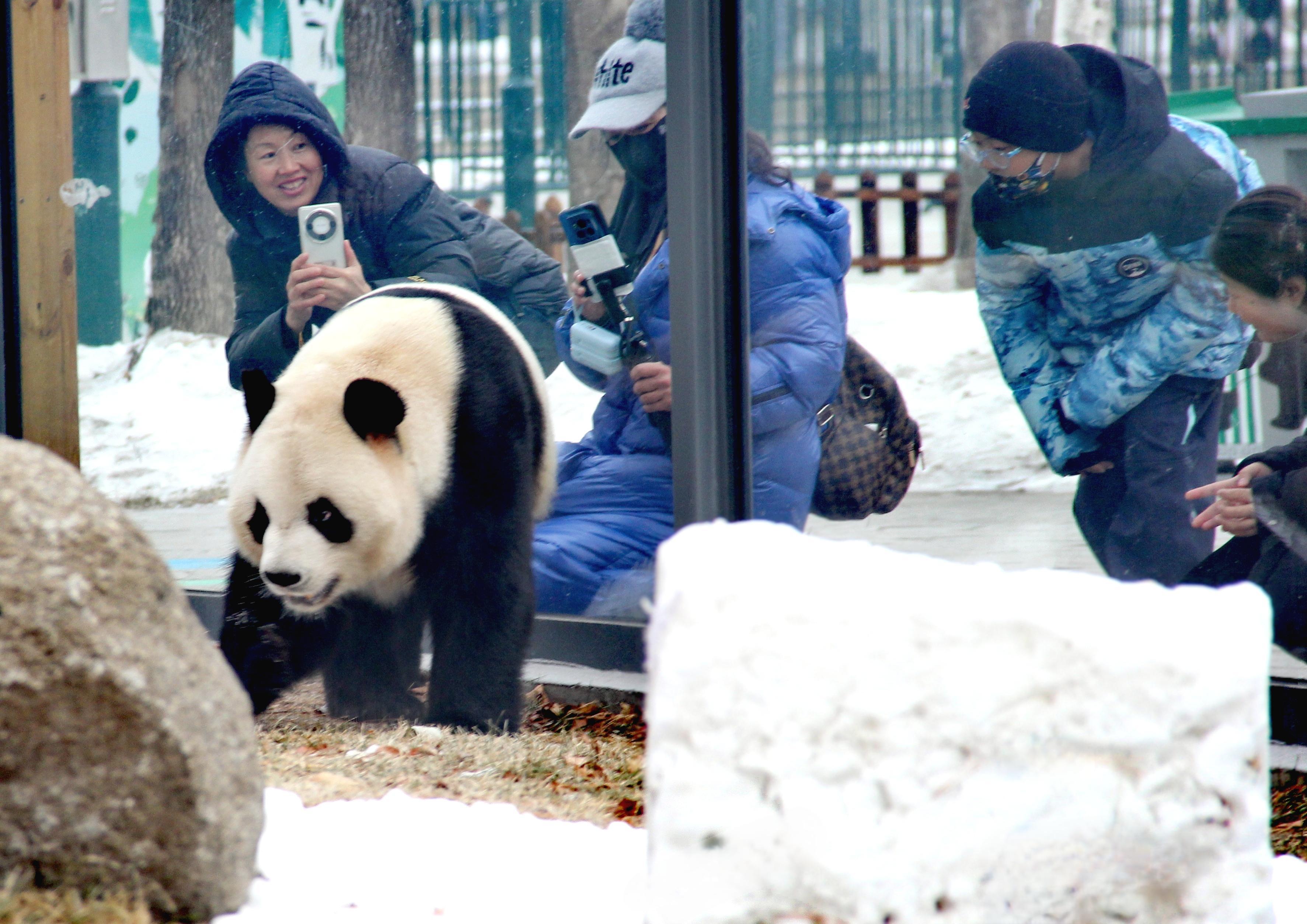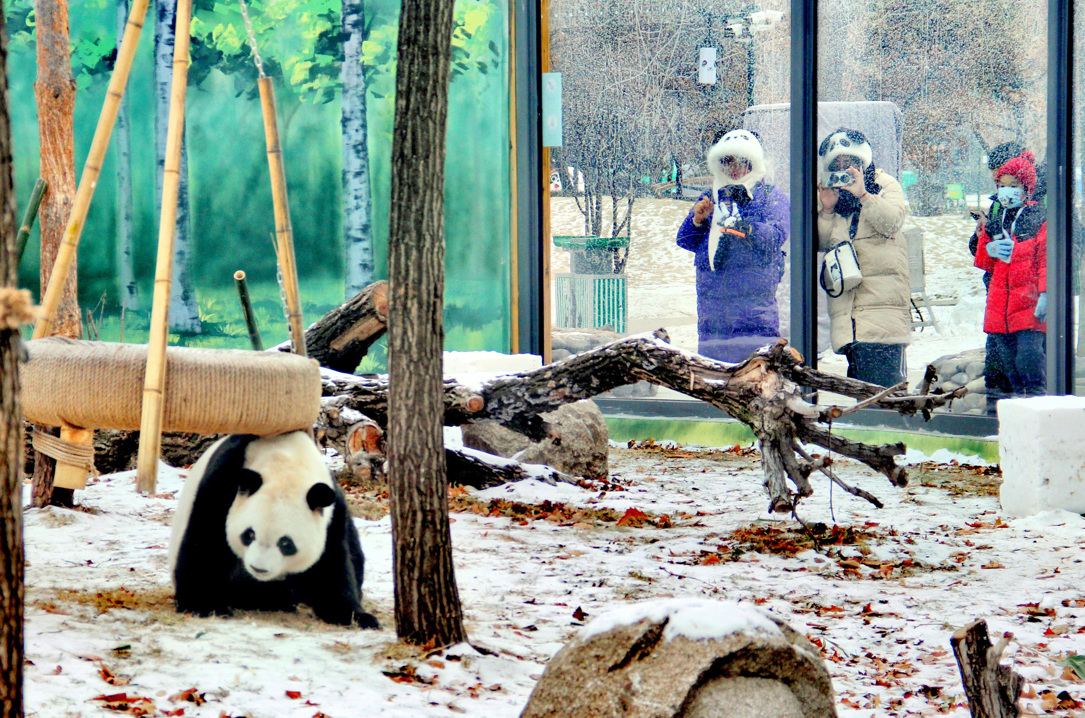 7日,哈爾濱太陽島風(fēng)景區(qū)大熊貓館內(nèi),許多南方游客在觀看“芝士”和“芝麻”兩只大熊貓在冰天雪地里的生活。