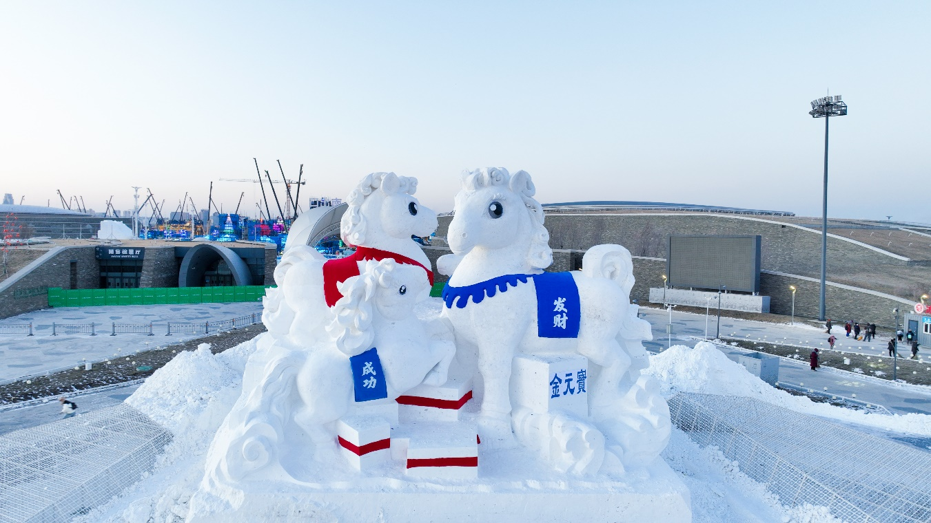 為迎接即將到來的生肖馬年,哈爾濱冰雪大世界結(jié)合“冰天雪地 童話世界”主題,對雪雕形象進(jìn)行了童話主題創(chuàng)作,同時聽取游客意見,雕刻了小馬一家四口。
