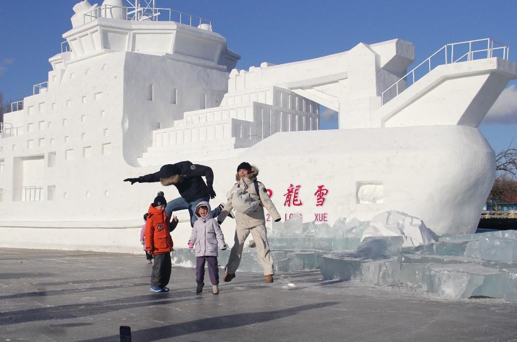 已制作完成“雪龍2號(hào)”雪雕吸引了眾人的目光。一些孩子爬到雪船前面的冰塊上玩耍、拍照,歡笑聲此起彼伏。