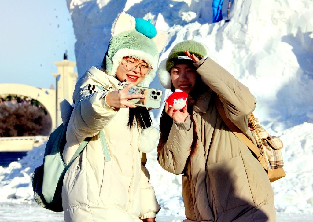 他們拿出手機(jī),以雪雕為背景,記錄下一個(gè)個(gè)精彩瞬間。
