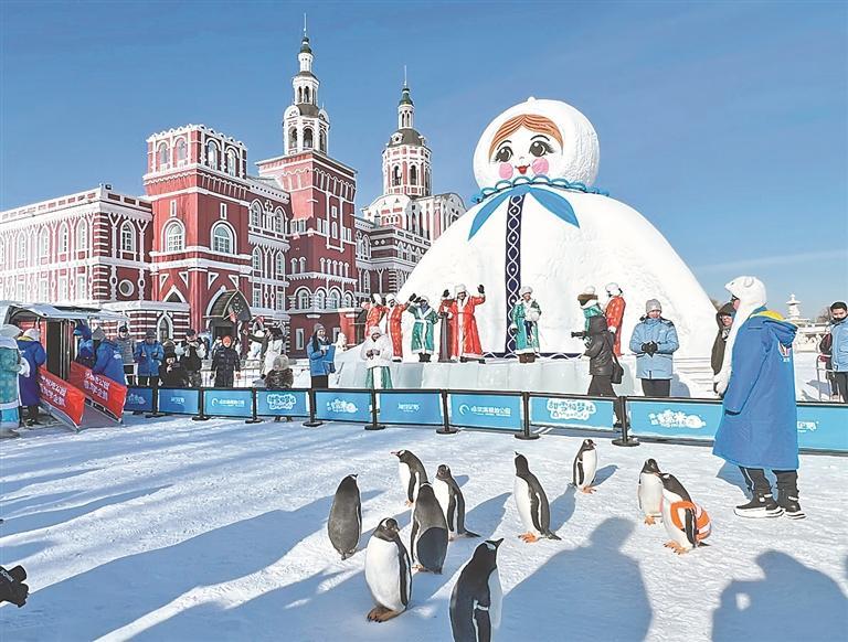 企鵝們與伏爾加大雪人同框。圖片由景區(qū)提供