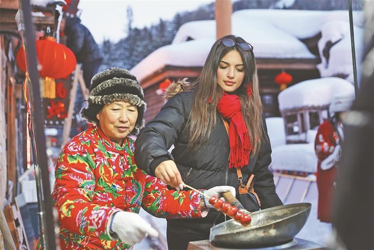 沿著雪韻大街向前,便遇上了熱鬧的雪鄉(xiāng)年貨大集。紅燈籠掛滿巷口,黏豆包、凍梨、凍柿子等攤點沿街排開,吆喝聲此起彼伏。留學(xué)生們穿梭其間,有的挑選福字春聯(lián),有的好奇品嘗著黏豆包的軟糯甜香,熙攘人群中洋溢著濃濃的年味,也讓他們提前觸摸到中國春節(jié)的喜慶脈搏。