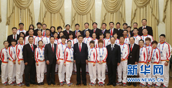 ??? 2月7日,中共中央總書記、國家主席、中央軍委主席習(xí)近平在俄羅斯索契親切看望參加第二十二屆冬季奧林匹克運動會的中國體育代表團。這是習(xí)近平同代表團成員集體合影。新華社記者 蘭紅光 攝