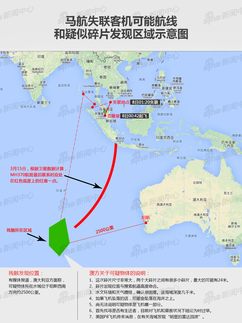 ??? 發(fā)現(xiàn)可疑碎片的位置與馬航失聯(lián)客機(jī)南部搜尋航道高度吻合